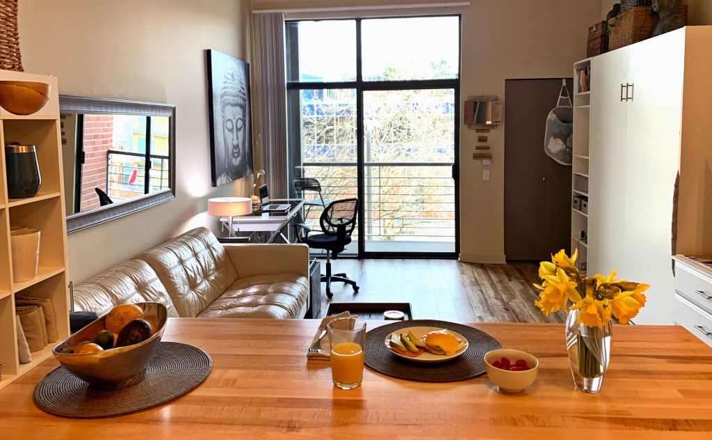 Wow! I am so grateful to my sister, Carrie, and her friend, Tammy, who fostered a win-win situation for me to sub-let this beautiful apartment! On Railroad Ave, right downtown, I have a great city view from my balcony! Tammy has outfitted this place with such style and grace, I am fortunate to have this haven. Carrie picked up my “click list” shopping from Fred Myers and brought it to my new home. She even packed up a few of my clothes so I will have more clothing options in this different climate.