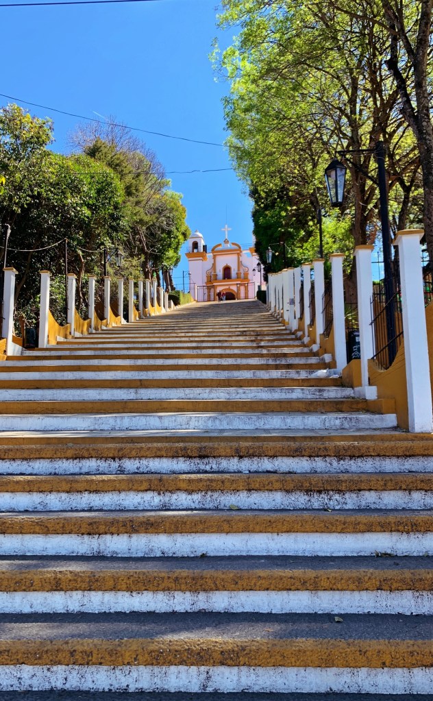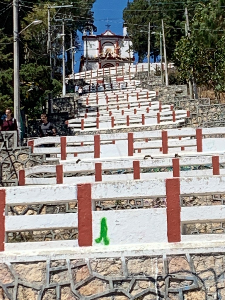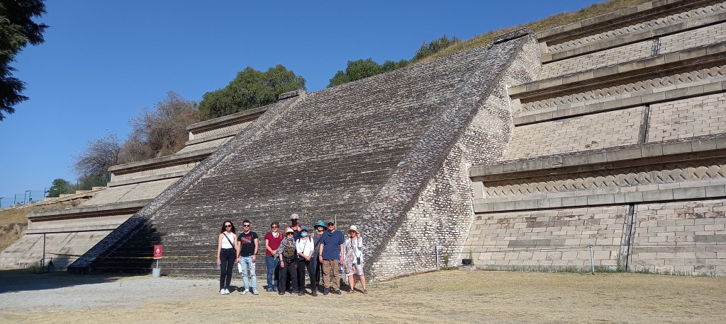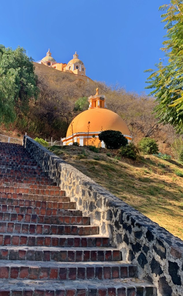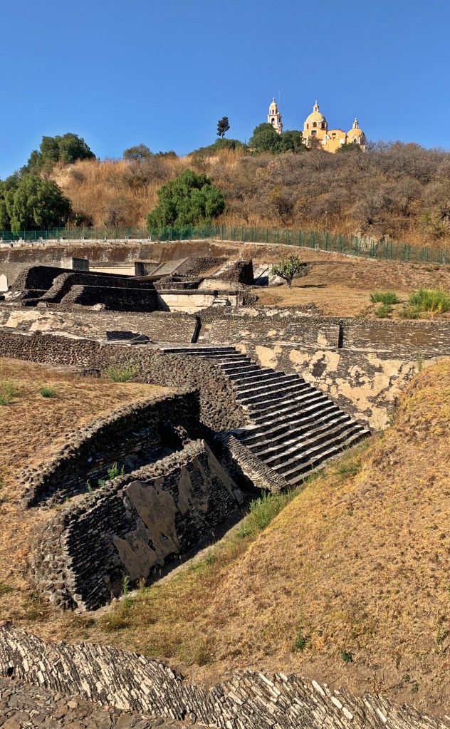 excavated pyramid with Los Remedios in the backgroundThe Group!The Group on the steps leading to the SantuarioSantuario de la Virgen de los Remedios – on top of the pyramidView from the topThe way down – great tiles help steady my feet!Guides love selfies and are quite good at taking them!