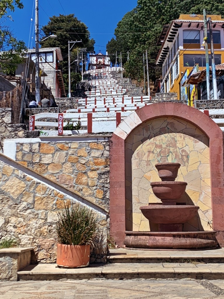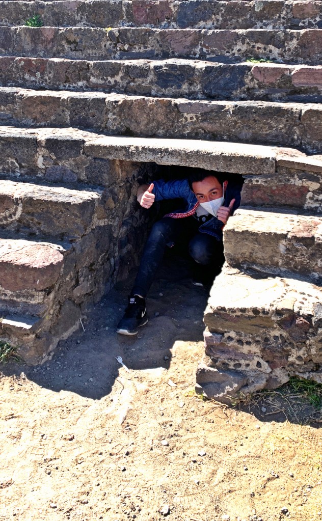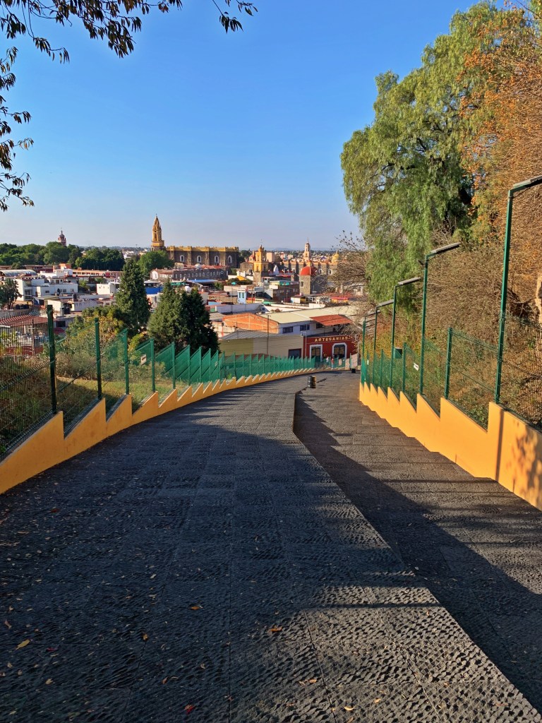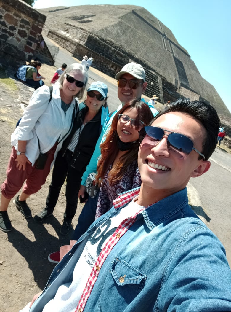 excavated pyramid with Los Remedios in the backgroundThe Group!The Group on the steps leading to the SantuarioSantuario de la Virgen de los Remedios – on top of the pyramidView from the topThe way down – great tiles help steady my feet!Guides love selfies and are quite good at taking them!