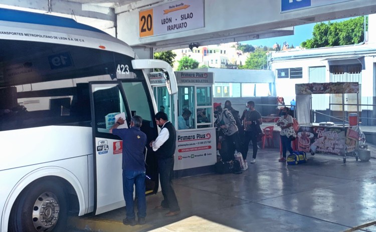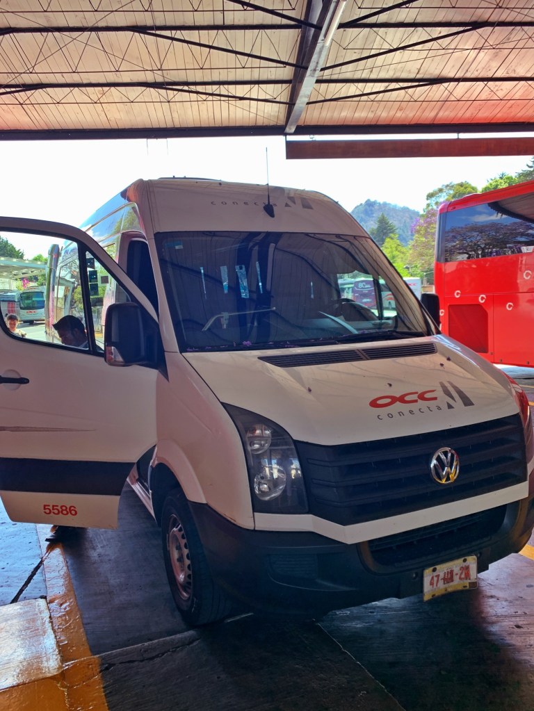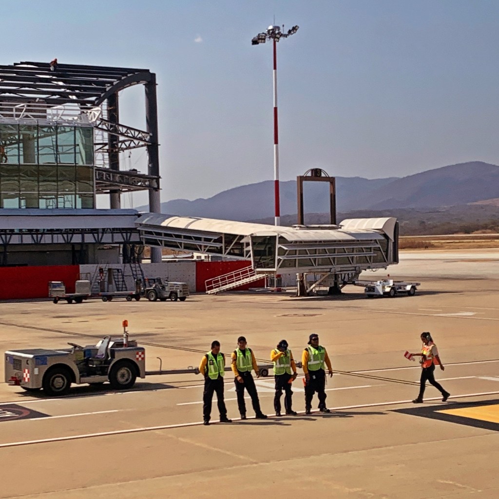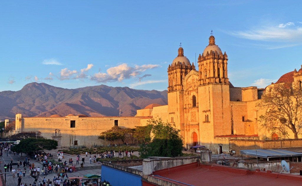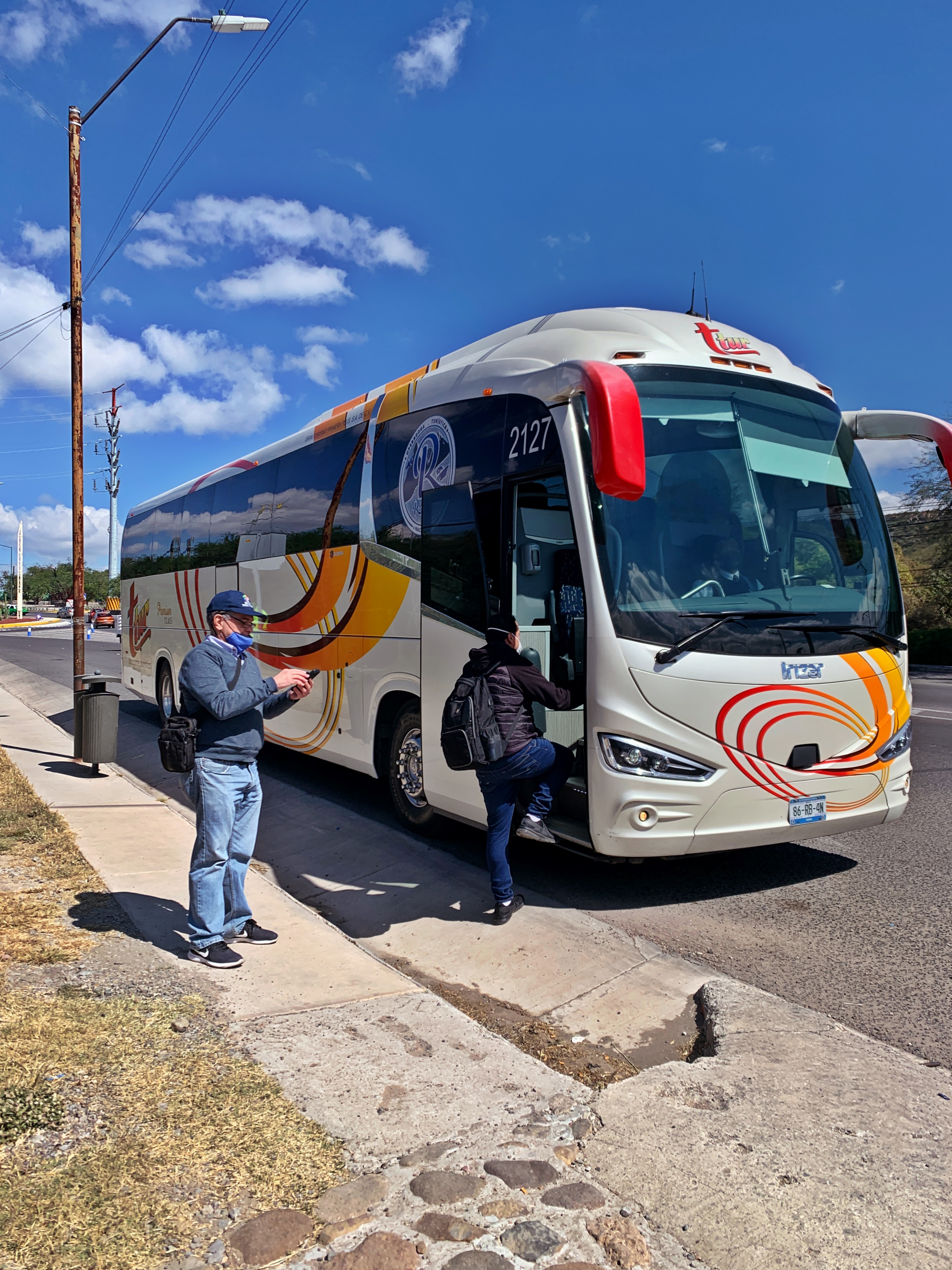 Church of the Immaculate Conception (aka Las Monjas) on the left and la Parroquía on the rightSame looking at them from under a tree decorated for ChristmasAn excellent chocolate mousse cake with “toasted honey jell-o”My luggage lined up and ready to go!UneBuses run on natural gas.SMA Central Bus StationSunrise over Mexico City as I flew inParroquía Las Santa Cruz, in Cihuatlán