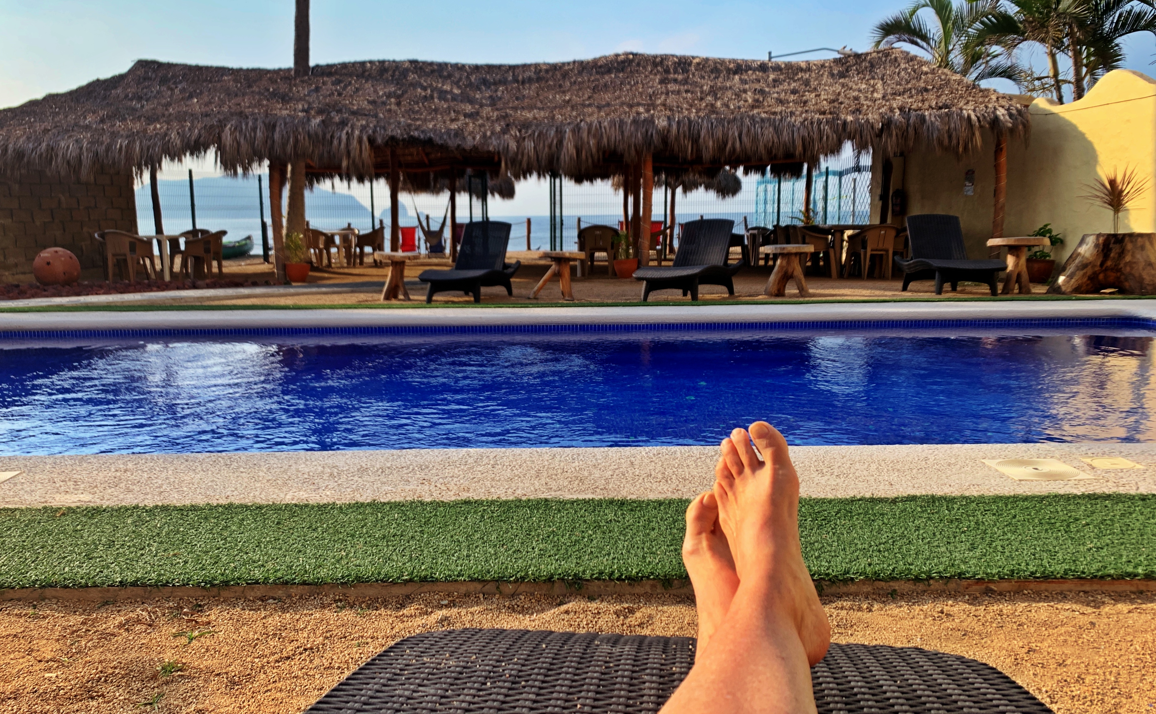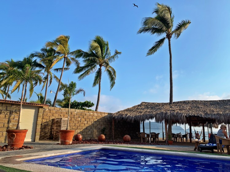 I was fortunate to get into my apartment earlier than check in time. This place has all the requirements for this stay: air conditioning (in the bedroom), Wifi (though any WiFi in this area is weak and inconsistent), a pool, a shaded area with access to The Beach, and this place did not disappoint! It is a small complex of only seven units, is less than two years old, and right next to downtown. This town is historically a fishing village and has about 7,500 residents (2010). The population swells during the winter months as expats from Canada and the US invade for about three months. They usually stay between one and three months and come back year after year.