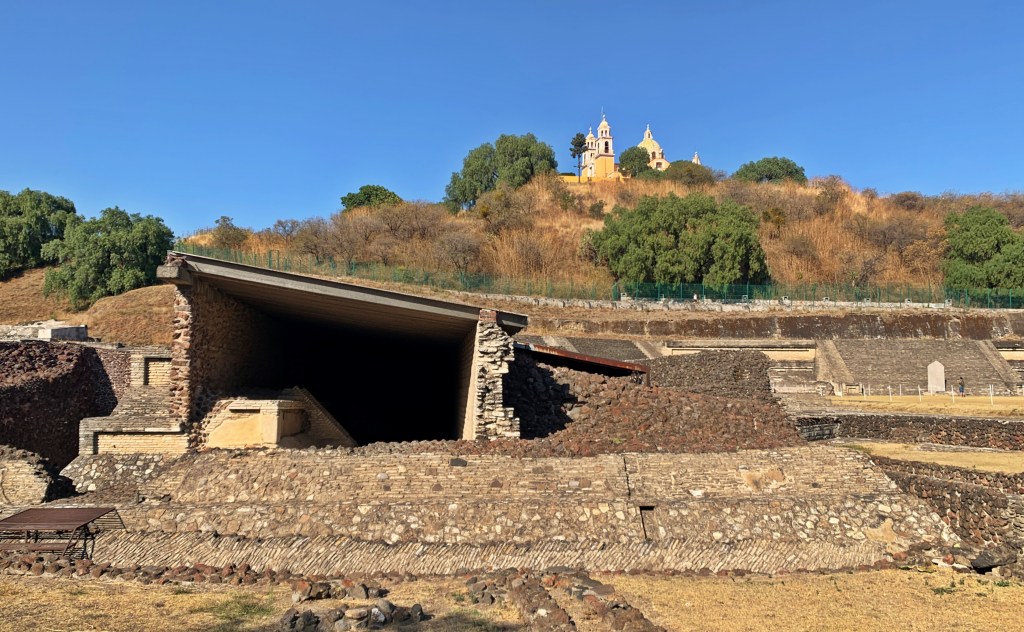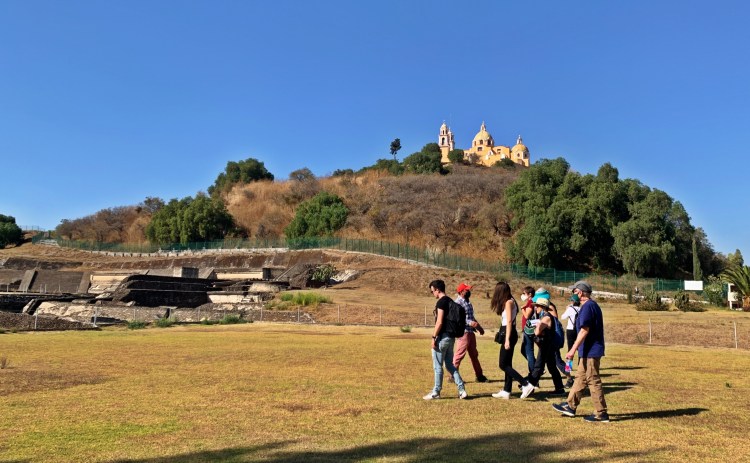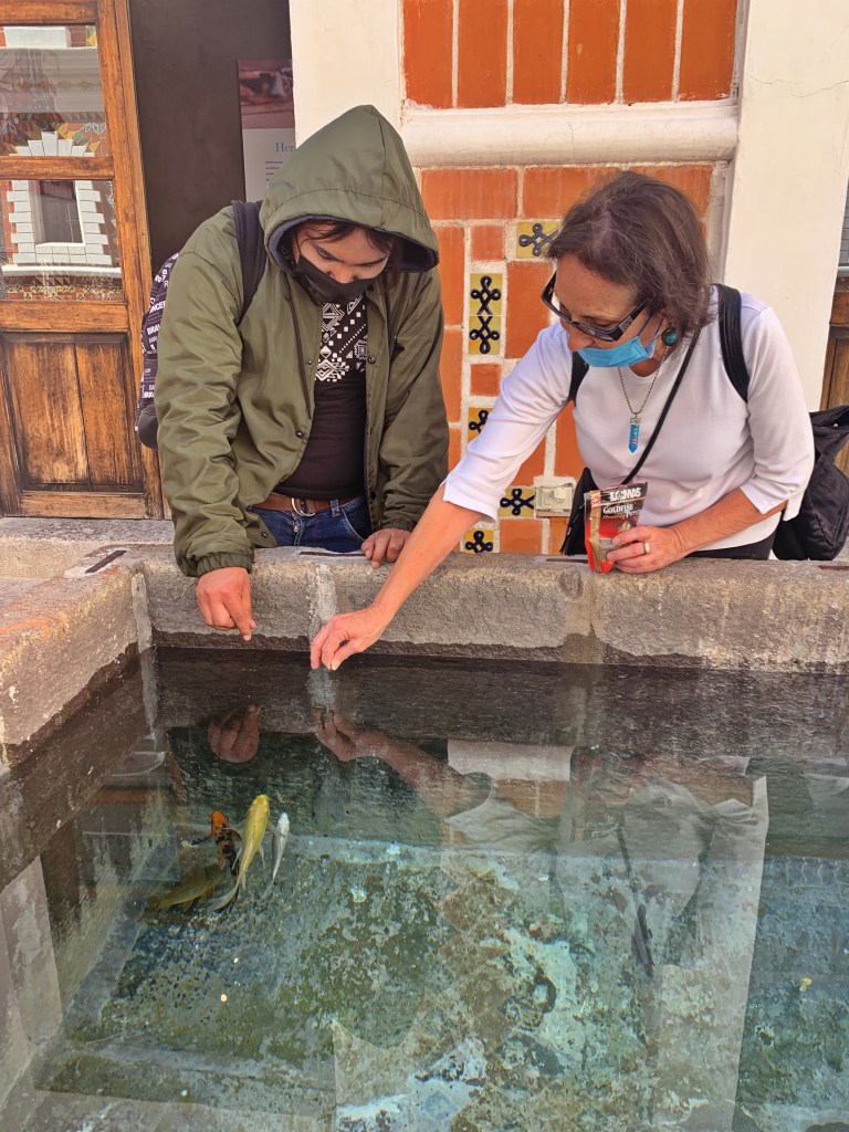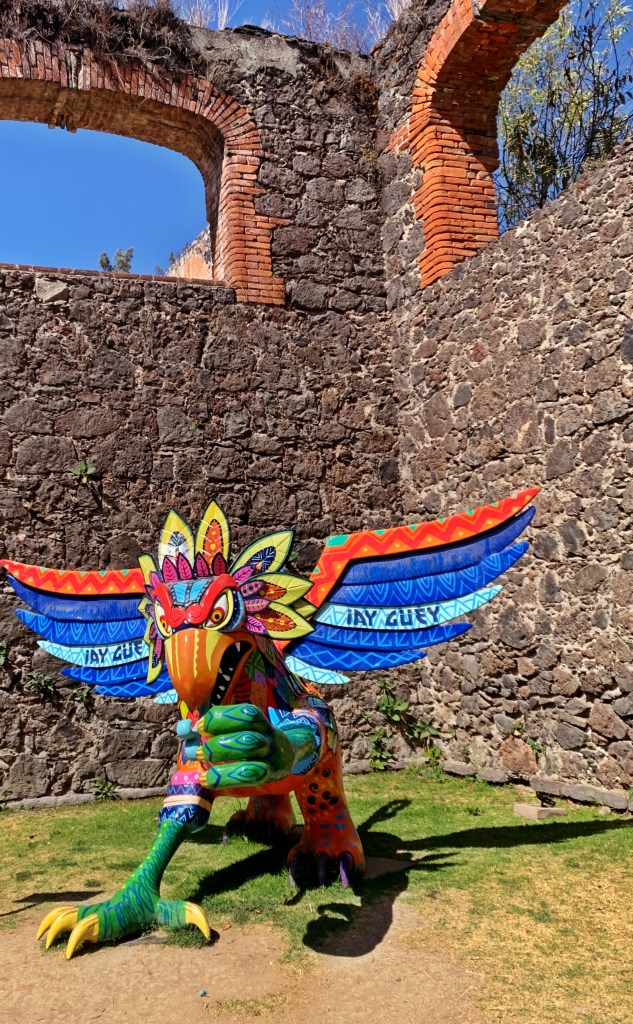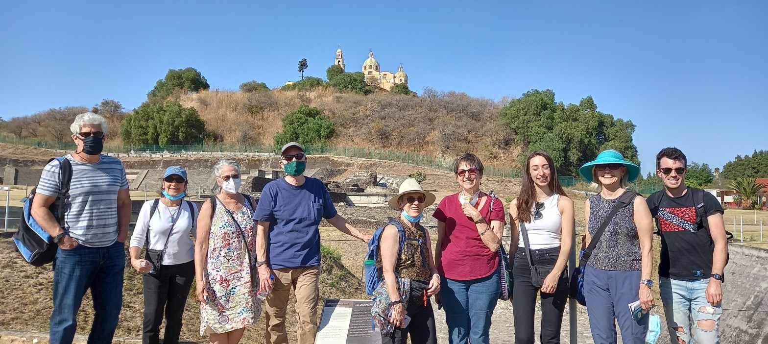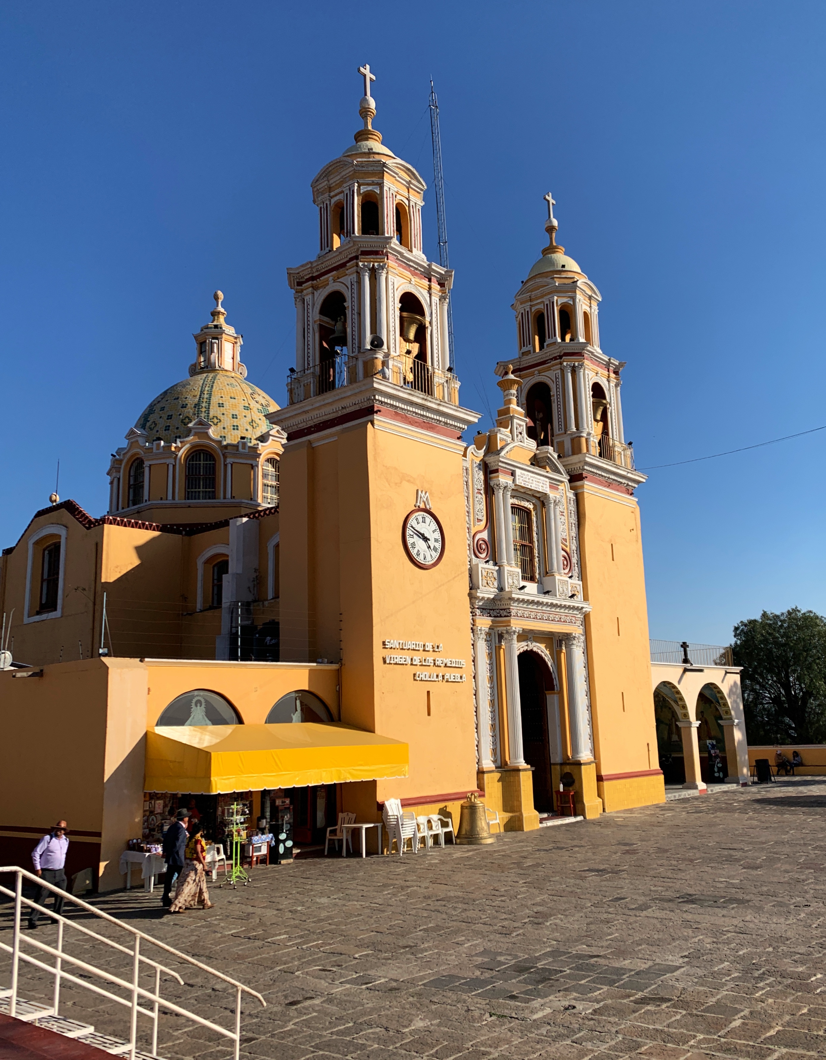 Offered once each three-week course, these two excursions are a highlight. The first one, Cholula, was quite popular with nine students participating. Our guide ushered us all into a van and we drove to the Great Pyramid of Cholula, also known as Tlachihualtepetl. The construction of the church on top was started in 1574, even though the Spaniards knew the significance of pyramid underneath. Or, more likely, they built it because of the significance. The pyramid was re-discovered in the early 1930’s and excavations were underway through 1970. No further excavations are allowed due to the risk of harming the church. (I find this an interesting repeating concept in Mexico: pre-hispanic vs. Spanish. ) During the explorations five miles of tunnels were built within the pyramids. These are closed now due to COVID. However, I had a chance to wander through them with my grandson, Sebastian, in 2019. They gave me a strong feeling of claustrophobia, so I was grateful I didn’t do that again. Mexico is very proud of the fact that theirs is the largest pyramid in the world – not in height, but in volume. It has a base of 1,480 ft. by 1,480 ft. and a height of 217 ft. This seems to be a popular destination for families. I appreciate that Mexico’s history co-mingles with daily life.
