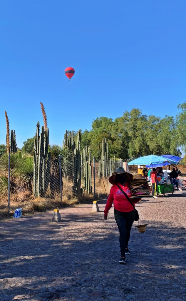 The big excursion goes to three places: the Teotihuacan pyramids, the Chapultepec Castle and the National Museum of Anthropology in Mexico City. We left at 7:30 am and returned at 7 pm. Only Robin and I signed up for the tour and we had three guides, plus the driver. The van was quite deluxe with comfy seats, air conditioning, and a large TV. It as a beautiful day and the hot air balloons were in force as we arrived.