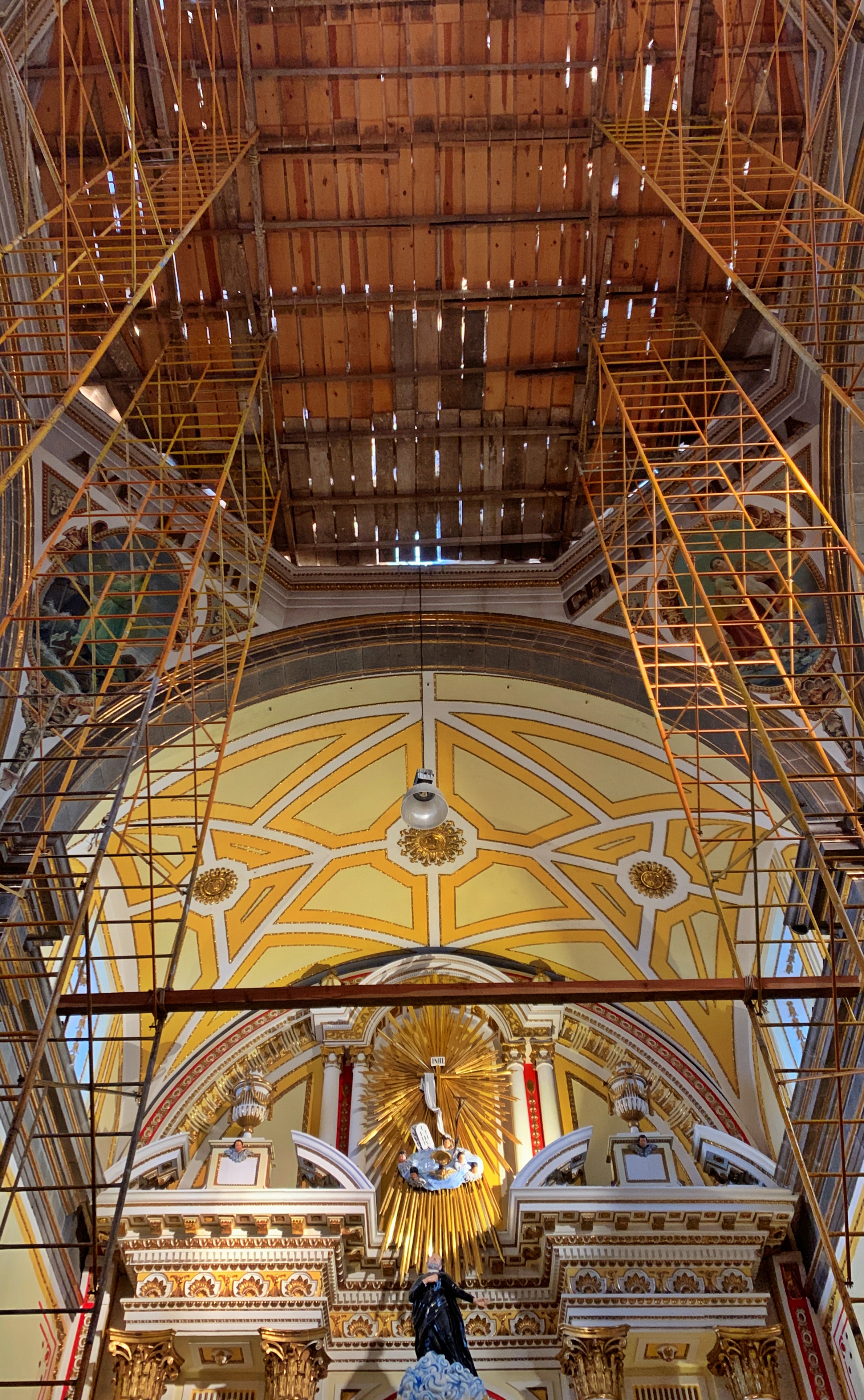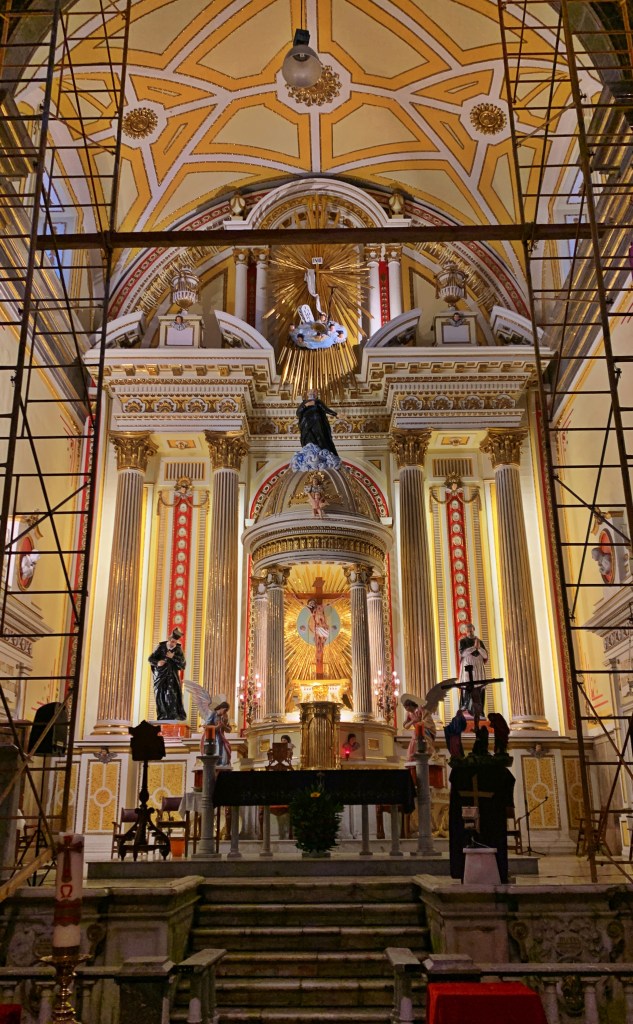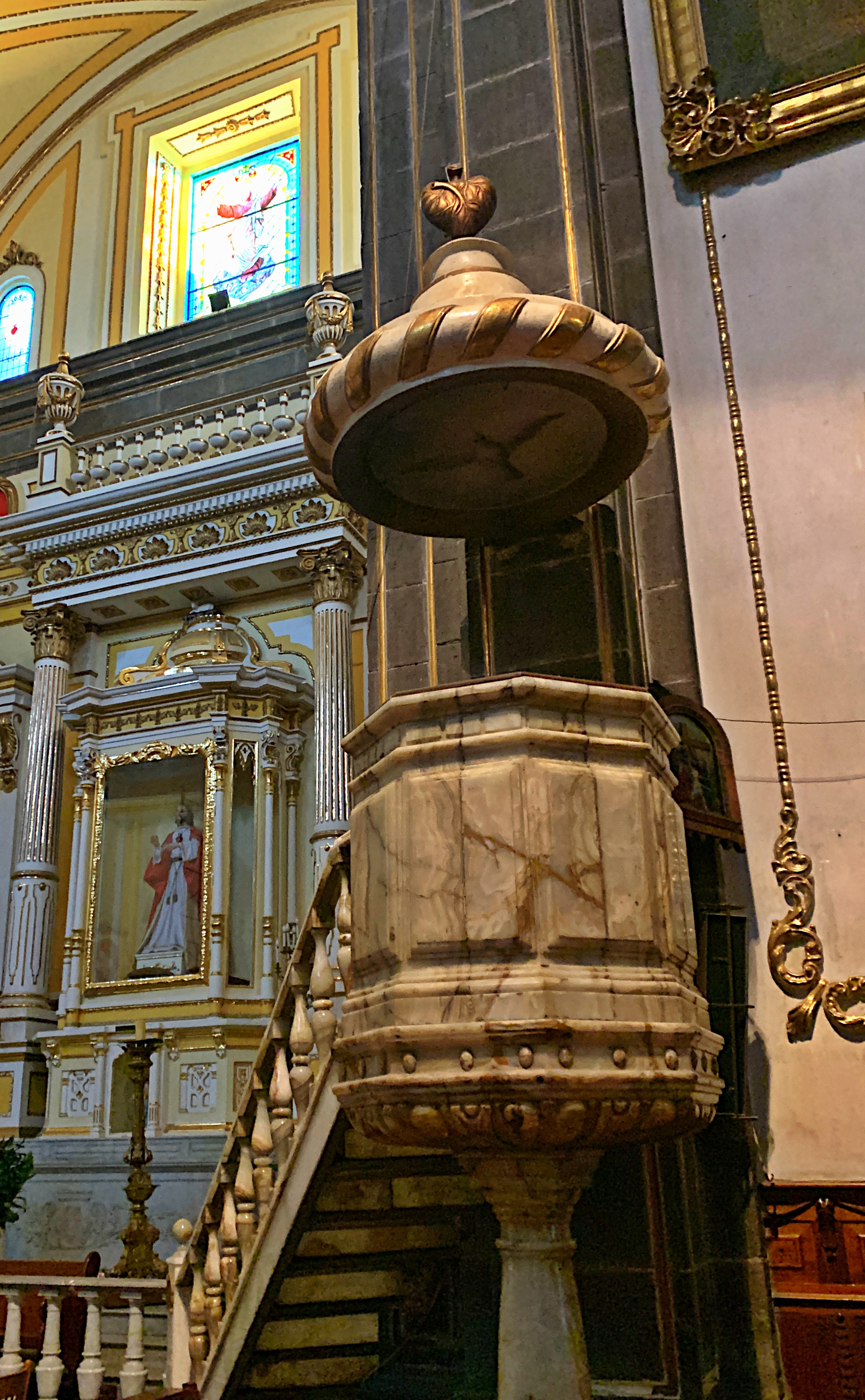 Fully revived and still full of wonder, I continued my search for wine. Finally, after walking almost four miles today, I gave up and turned for home. About a block from home I noticed that the church I thought was neglected had open doors. The first time I walked by I thought it had been abandoned, so I jumped at the chance to go inside. I was greeted by a man dressed informally in black who offered me the obligatory hand sanitizer. I wandered, respectfully, around the large room. I love the peaceful feeling I have in Puebla’s churches – I feel connected to my religious relatives. Soon the man who welcomed me was at my side acting as a guide. He proudly showed me features and responded to my questions. I dropped what little moneda (coins) I had into the donation box. The loud clank made me think that I was one of the few people visiting tonight.