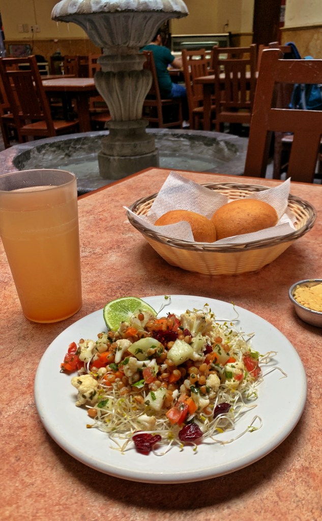 The break roomThe classroomsLaura – my first teacherEvelyn – my second teacherLunch included agua de fruta, rolls, salad (all pictured), and two entrees (which I could seldom eat)!This lovely vegetarian restaurant was where I ate most often.