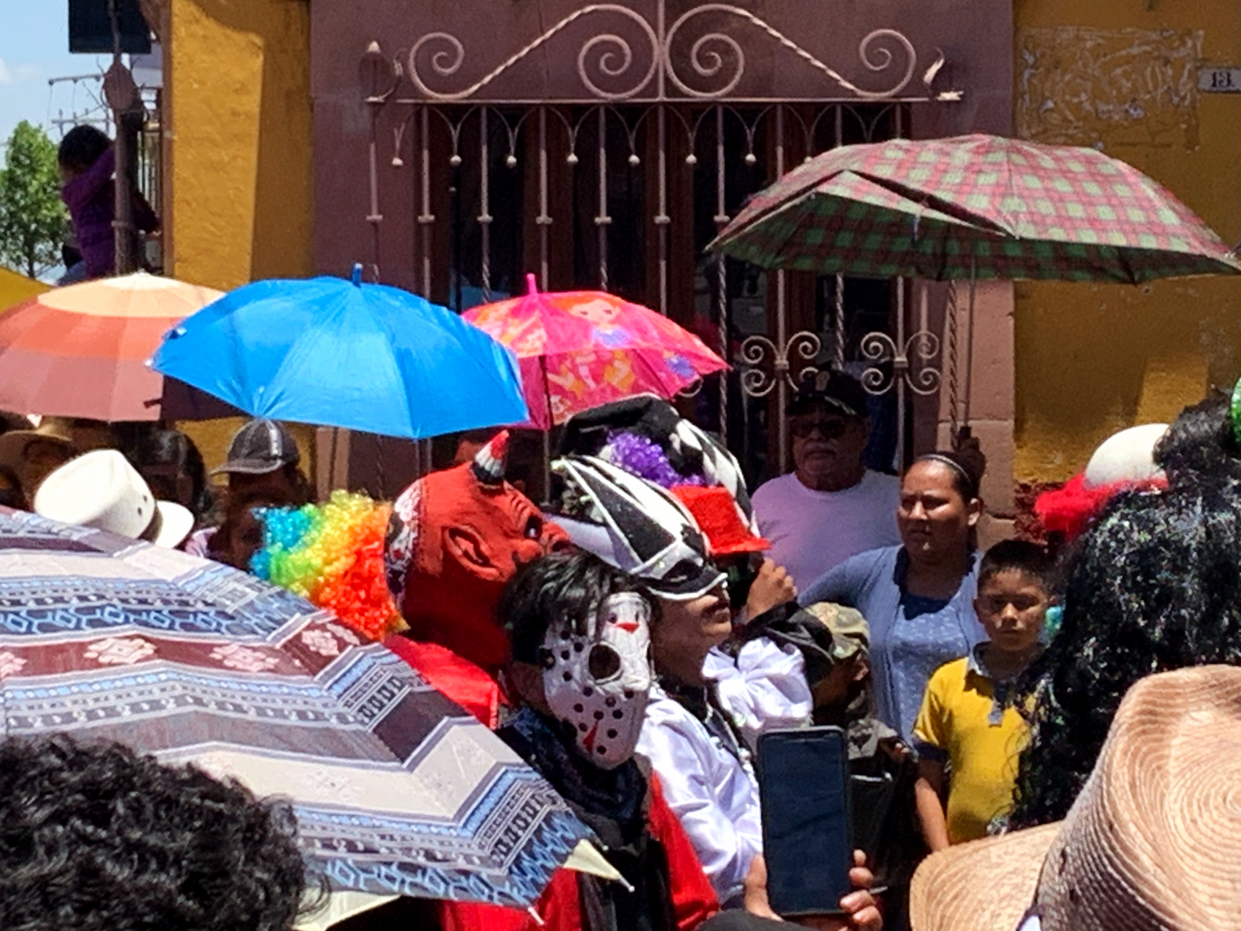 I don’t know why anyone would put so much costume on during the heat of the day! There were families, groups, and individuals. During the parade they all seemed to be crammed in the street and bobbing in time to the loud music pulsating from large amplifiers. Periodically, they would shower bystanders with pieces of hard candy.
