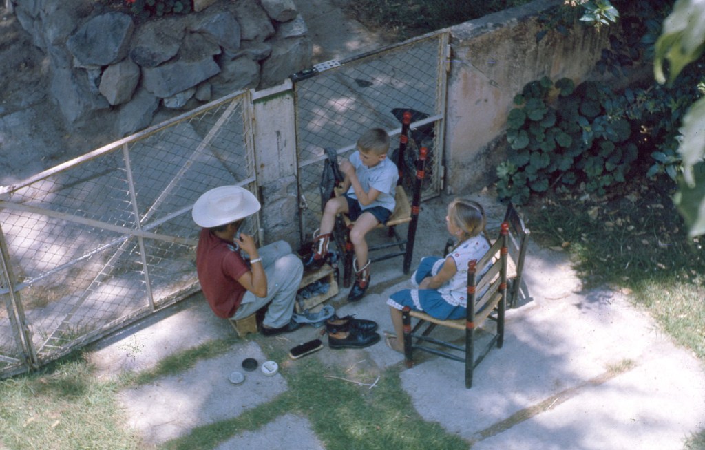 I love what this photo captures – a charming street kid, named Juan, became quite a support for our family. Besides his stand-by of shoe shining, he would do odd jobs, including entertaining Thom and I – once by making a toy out of tying a string to an iridescent green, flying bug! We loved holding one end of the string and playing with the bug on the other end!
