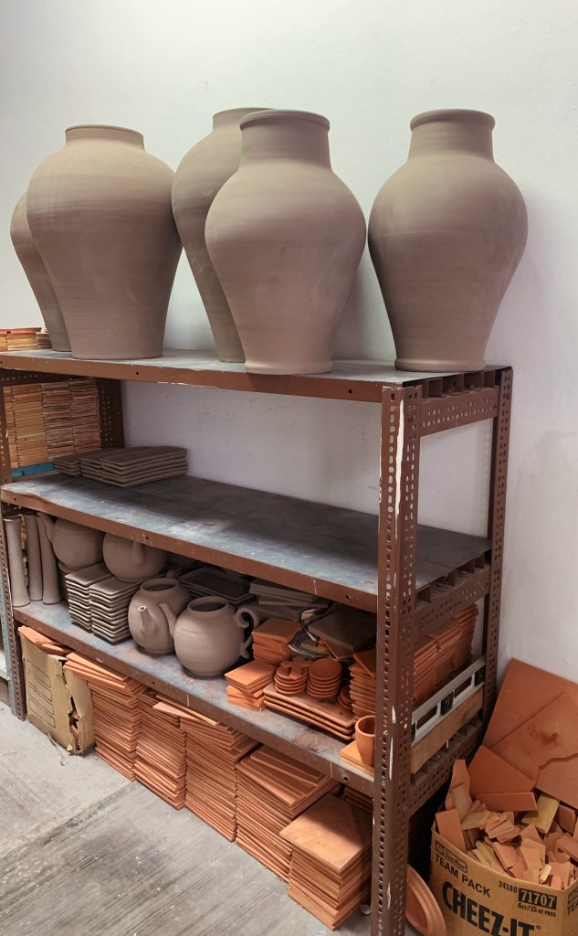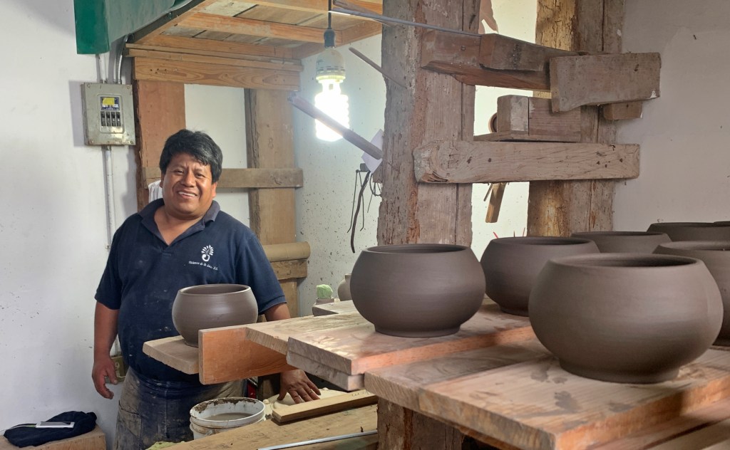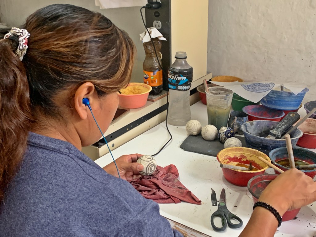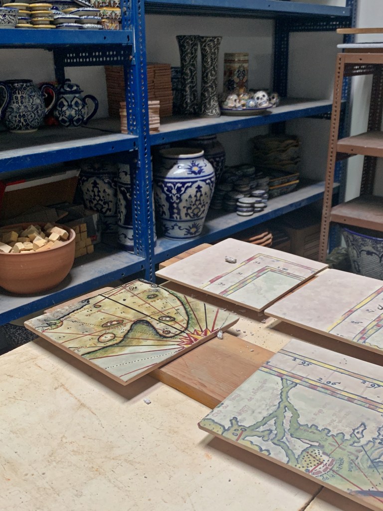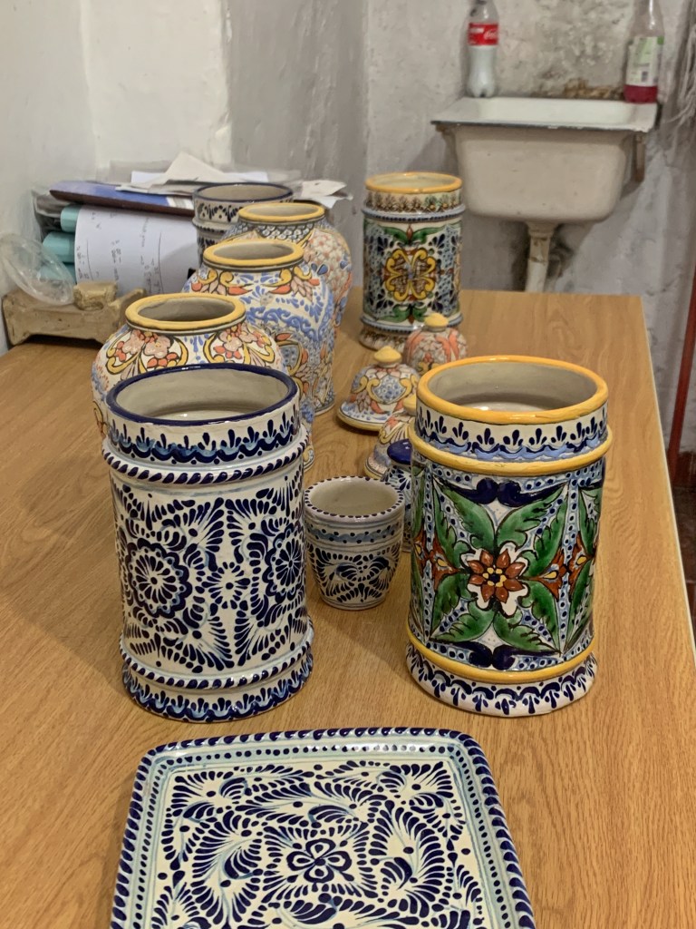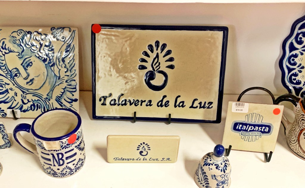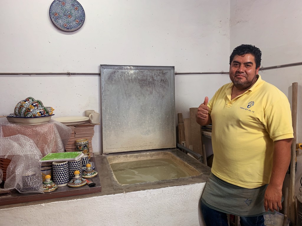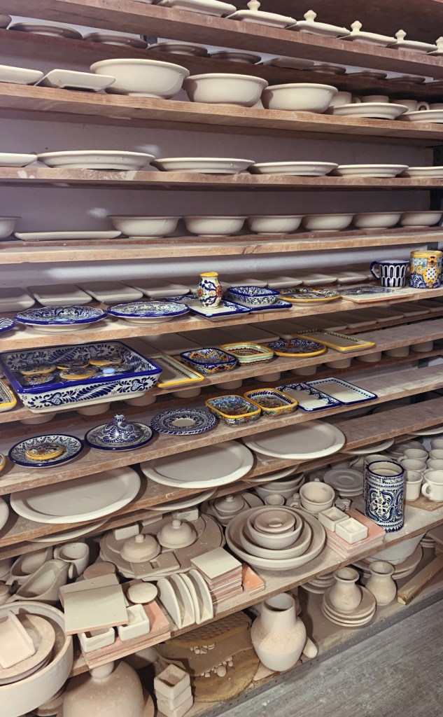 My guide from the Institute, Adriana, also took me to the Talavera de la Luz where they make the treasured Talavera pottery of Puebla. We showed up at 3 pm and the young man in the yellow shirt gave the two of us a complete tour. He showed us the white and black clay that is mixed with water to form the gray clay. The clay is stomped by feet, like grapes for wine, and kneaded by hand, like dough, until it is ready to be molded into plates, pots, and more.