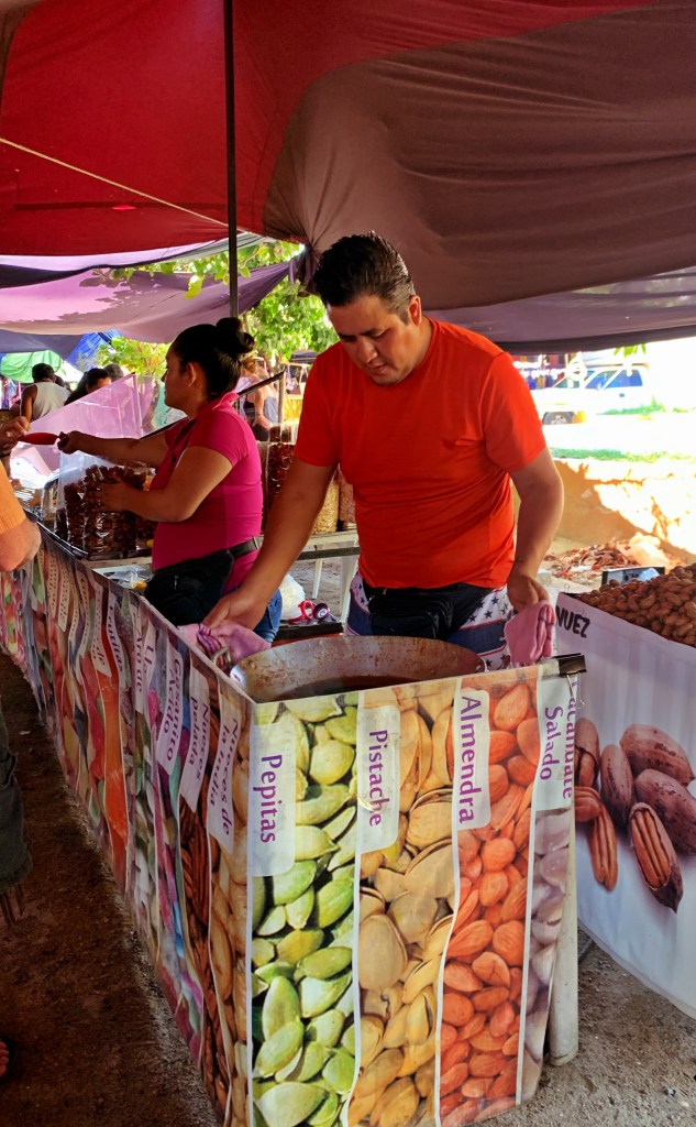 I am intrigued with grasshoppers. Almost every corner has a couple of buckets of them for sale. I have tasted them in quesadillas, tacos, salsas, and more. I have even bought my own salsa with grasshoppers blended in. I finally bought them (see last photo). I’m not sure what I’m going to do with them. I’d love to bring them home and make a special salt blend that a bar tender told me about: equal parts sea salt, pasilla chili (smoked flavor), and Chapulines. I’d love to add garlic, too.