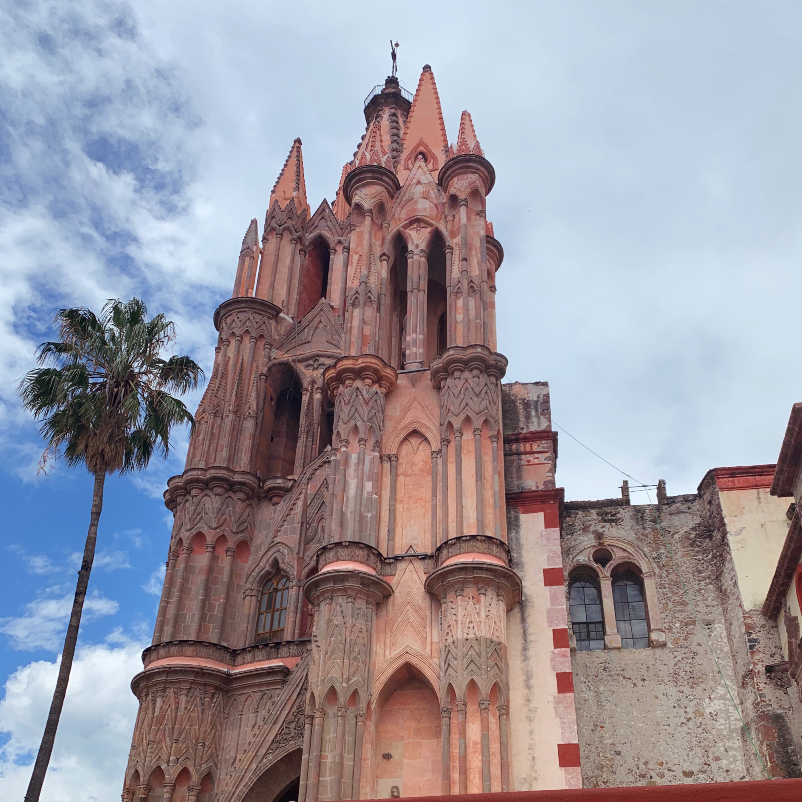 I have been very impressed with parking lots! For one thing, they are generally hidden by large doors, so you don’t even see the possible expanse of cars. This one is my favorite as it has murals on the wall – and it has a bit of a view of the Parroquia to the right!